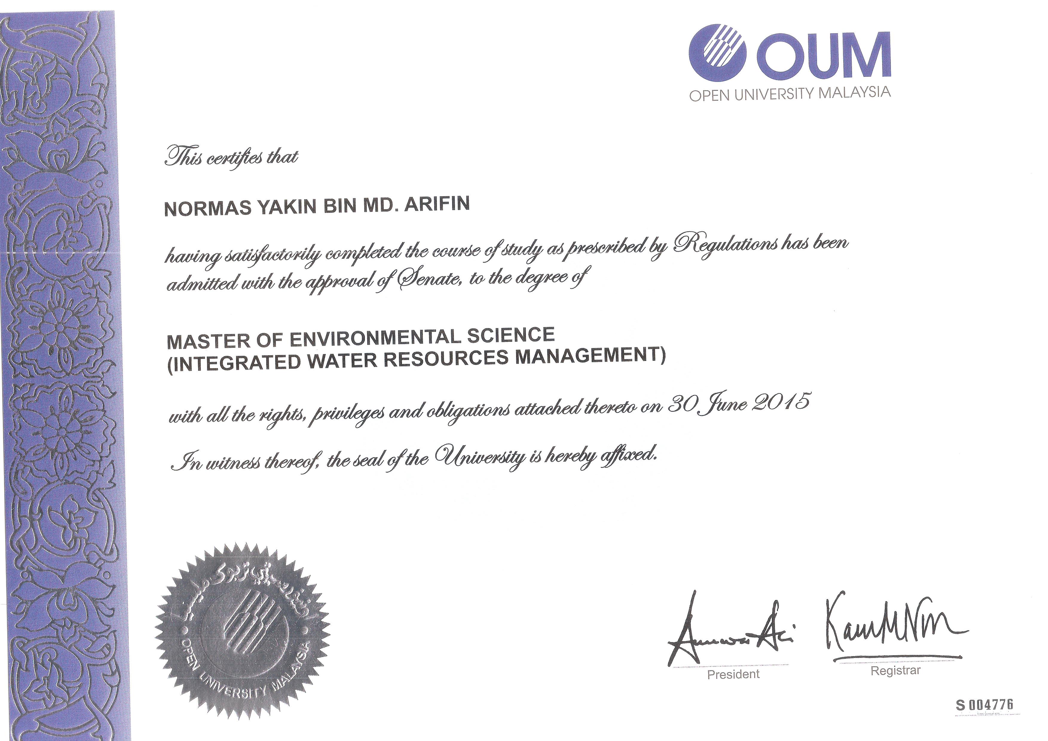 I have just graduated with a Masters in Environmental Science from the Open University of Malaysia last month. It was the culmination of two plus years years of weekend classes and another three of doing research, well one year of planning, 30 days of collecting data and almost two years of writing up the report (hardworking; I am, genius; I am not) about the link between golf course fertilisation and nutrient in the river water inside a particular golf course. I’m sure that my sponsor is happy, my scholarship being my savings from the Employees Provident Fund. I’ve even had to resign from a job that made me work on weekends to start my classes.