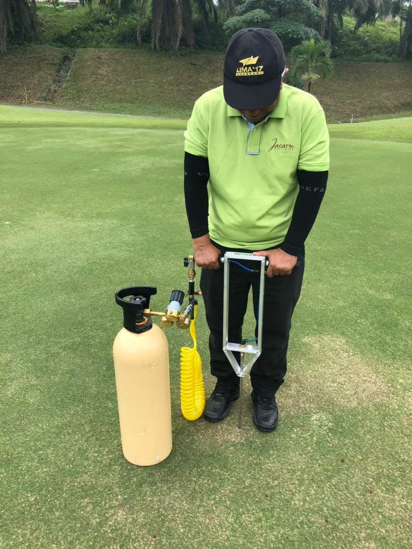 Alat ini dipanggil ‘Air Spike’. Kita akan cucuk besi tajam yang mempunyai lubang halus di muncungnya ke dalam tanah dan bila kita picit suatu punat, udara yang berada di bawah tekanan (compressed air) akan melalui batang besi dan ke dalam tanah.