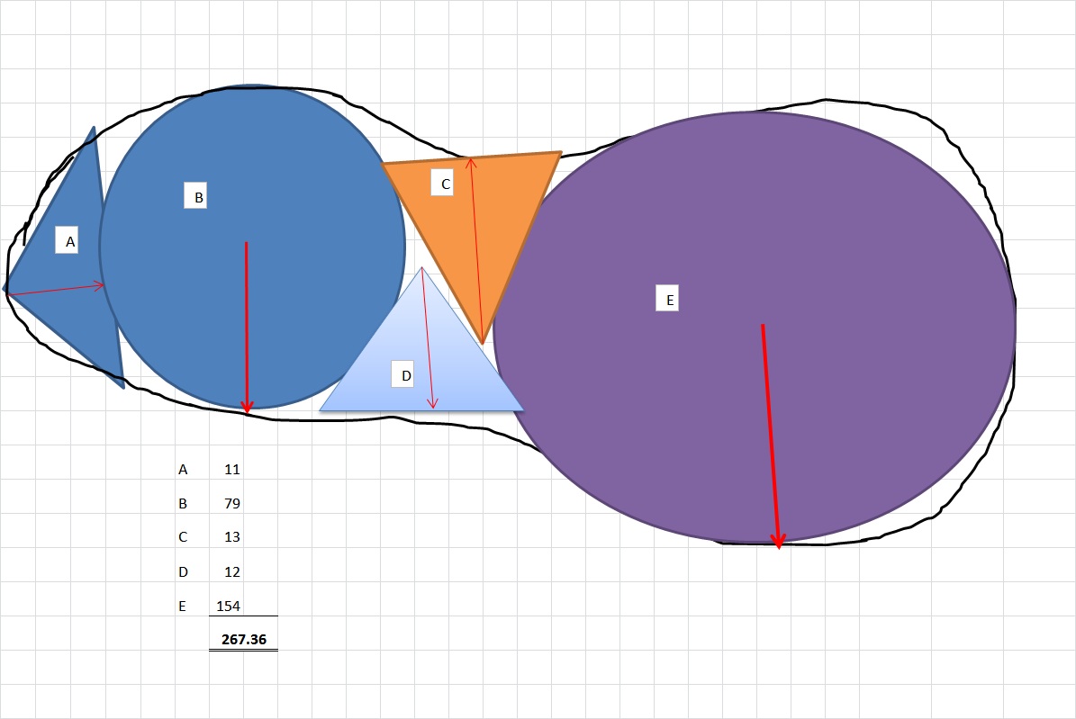 1. Lukiskan bentuk geometri muat-muat kedalam kawasan tersebut. Gunakan cat untuk tanda kawasan. Anda tak perlu cat semua sempadan ataupun nak lorek (colour) bentuk tersebut seperti contoh di bawah. Memadai hanya dengan menanda sempadan yang bertemu dengan bentuk lain ataupun dengan sempadan luar. Untuk bentuk bulat, pacak besi tajam, ikat tali dan tanda putus-putus ukurlilit bulatan. Kemudian ukur luas setiap bentuk geometri tadi seperti di ajar guru di sekolah (boleh juga tanya anak kat rumah) dan campurkan semua luas mereka.