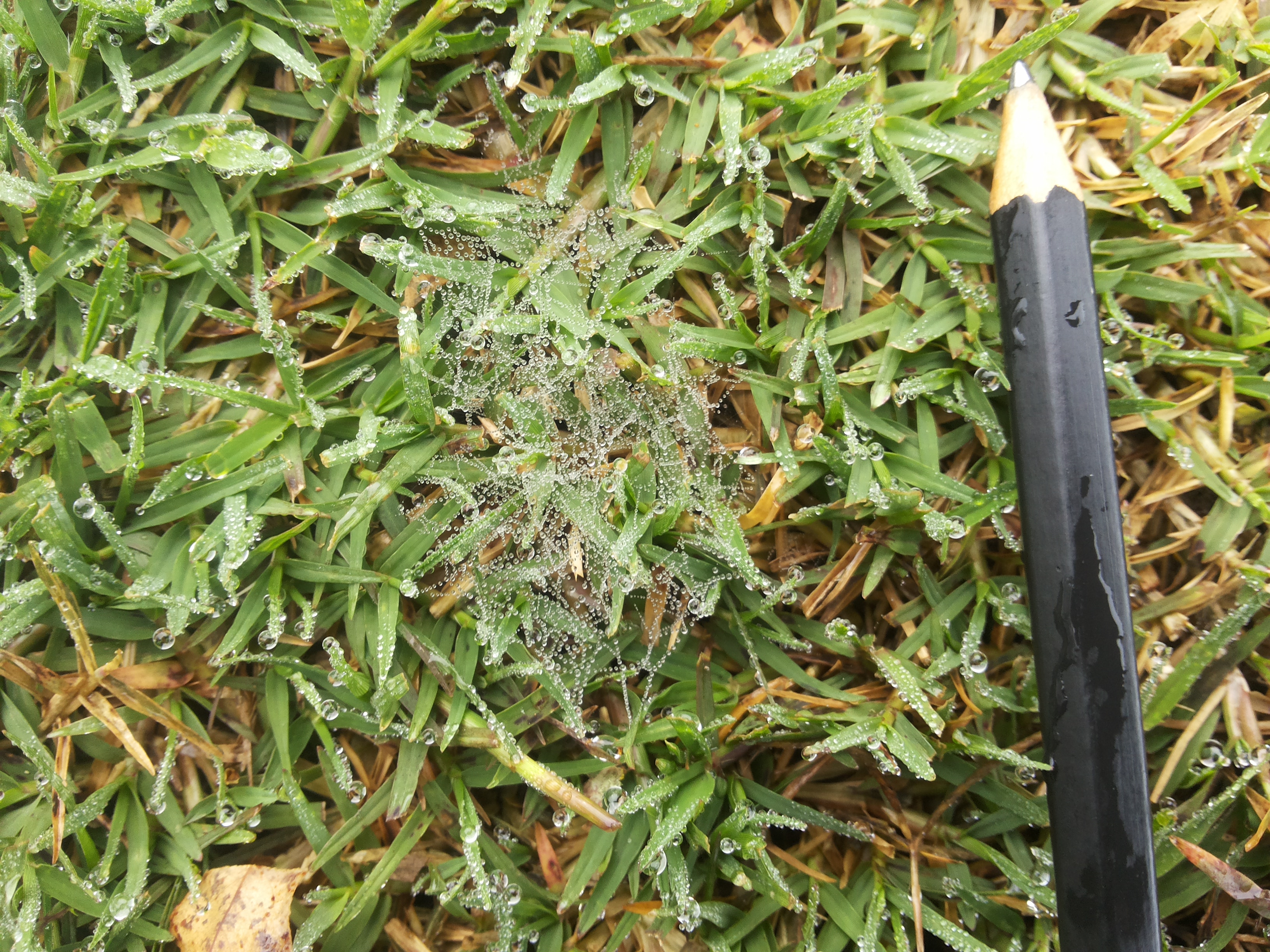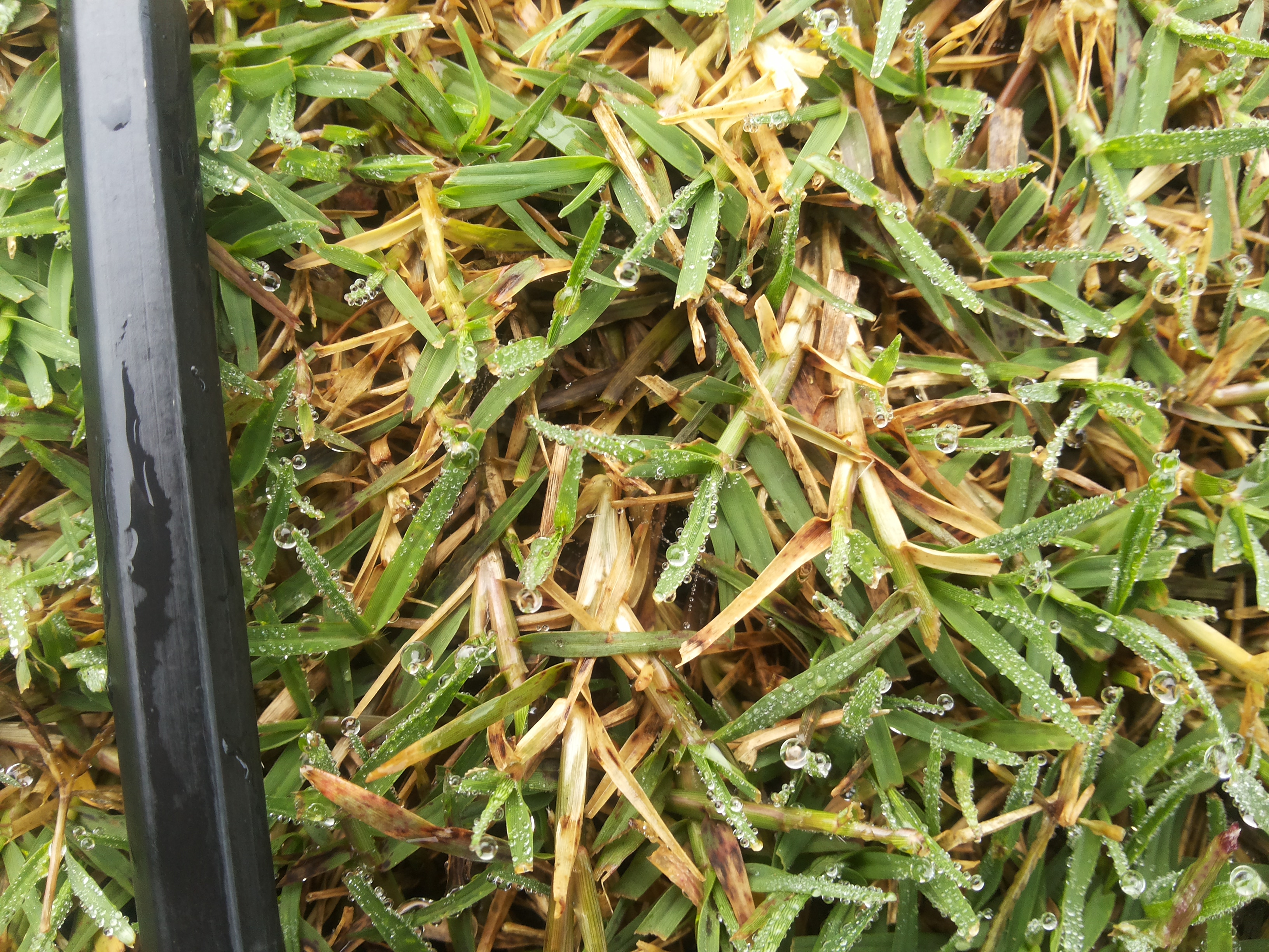 Kesan pembajaan tabur-tangan yang tidak samarata. Kita boleh lihat rumput yang di baja lebih subur dari rumput kelilingnya.